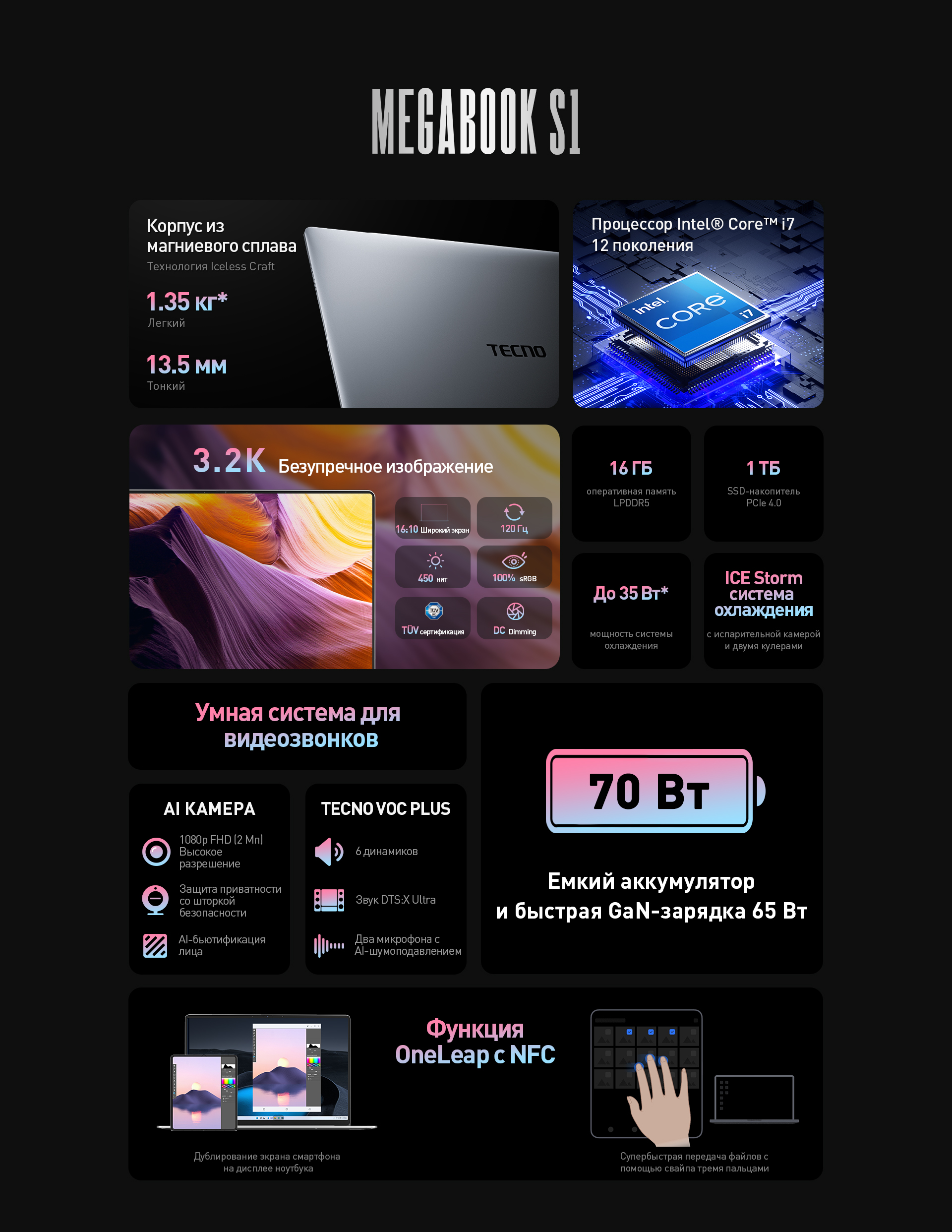 Премиальная серия ноутбуков TECNO. Корпус MEGABOOK S1 сделан из магниевого сплава с нанопокрытием и весит всего 1.35 кг, а его толщина — 13.5 мм. Безупречное сочетание элегантности, удобства и технологичности в одном устройстве